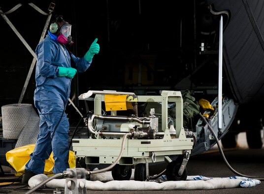 An Airman from the 910th Airlift Wing, Youngstown Air Reserve Station, Ohio, gives a “thumbs up” to an Airman to begin transferring insecticide to a C-130 Hercules June 25, 2014, at Joint Base Charleston, South Carolina. The spray crew was in Charleston to spray for mosquitos on JB Charleston and is the only unit of its kind in the Air Force. (U.S. Air Force photo/Senior Airman Dennis Sloan)