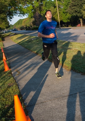 Airman 1st Class Anthony Tressel, 628th Communications Squadron radio frequency transmission systems technician, sprints to the finish line during the 5K Fitness Challenge Run Apr. 11, 2014, on Joint Base Charleston – Air Base, S.C. The Fitness Challenge is held monthly to test Team Charleston’s fitness abilities. This month's Fitness Challenge raised awareness on sexual assault. Tressel was the top male runner with a time of 18:12. (U.S. Air Force photo/ Airman 1st Class Clayton Cupit)