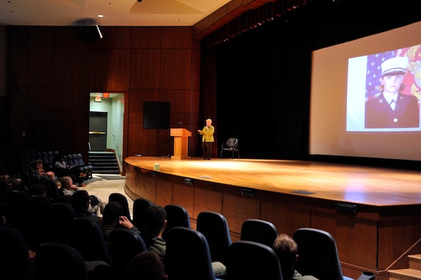 Mary Lauterbach speaks about her daughter's sexual assault during her speech to members of Joint Base Charleston during a Sexual Assault Awareness Month event April 11, 2014, at the Air Base Theater on JB Charleston, S.C. Lauterbach’s daughter, U.S. Marine Lance Cpl. Maria Lauterbach, was sexually assaulted and murdered while on active duty in 2007. (U.S. Air Force photo/Staff Sgt. Renae Pittman)